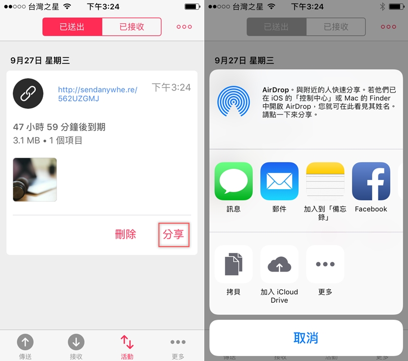如果不用輸入代碼的方式也可以用 QR Cord,或是按「分享連結」,就會產生一個 48 小時內有效的網址連結,讓你可以分享到 FB、Line 或郵件。