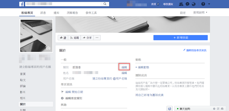 專業的所有內容都可在這裡更改細節,假設阿湯設的類別是部落客,在旁邊點「編輯」。