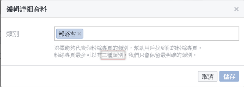 Facebook 提示最多可以有三種類別,但他們只會保留最明確的類別,什麼是最明確的就看他們定義了,總之先將「部落客」點叉叉。
