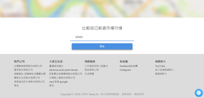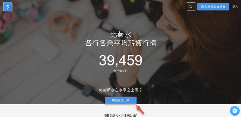 首頁就顯示目前各業的平均薪資,你有在平均之上嗎?點「開始查詢比較」。