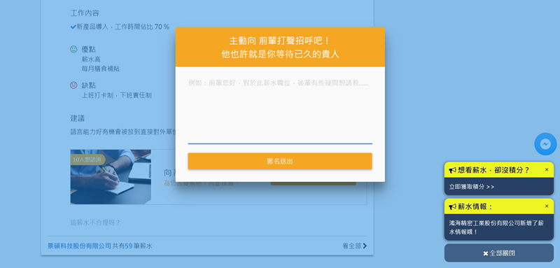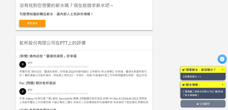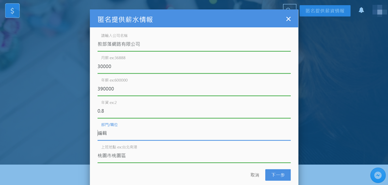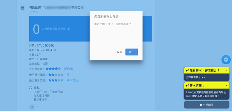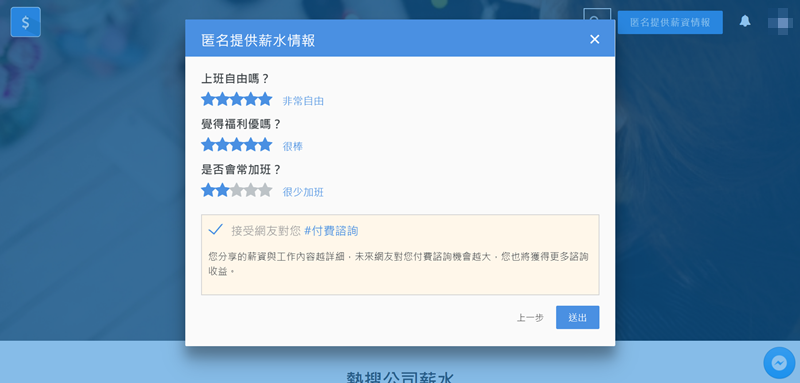 會希望你登入社群網站後提供薪資情報,像是公司名稱(輸入首字就會跳出相關結果)、月薪年薪、職位等,如果不提供就會沒點數,差別就在使用網頁時查不到更詳細的資訊。