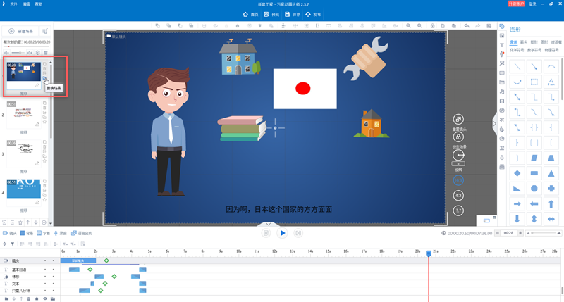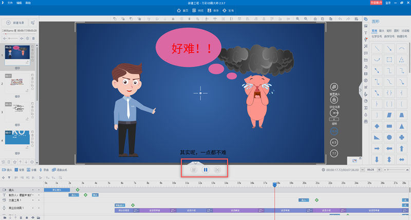 匯入後可以先點底下圖示播放一遍,大致上左邊欄是每張影格的大綱,右邊是各種素材的調整,而下方就是時間軸,可重疊多項時間軸放置文字、圖片、特效等。