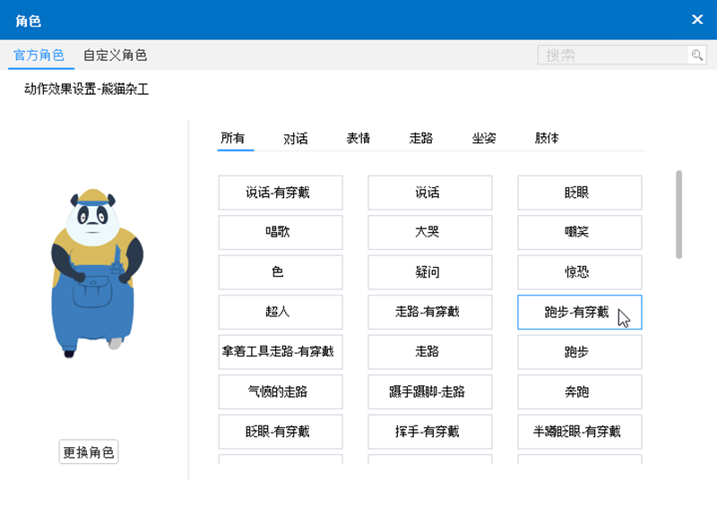 不是那麼簡單一張圖而已哦,他會動,而且有各種姿勢、動作、裝扮可任意更改,例如阿湯選擇一個穿吊帶褲的、跑步中的熊貓。
