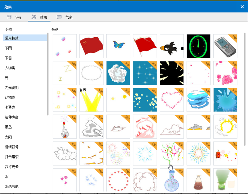 也可加入各式各樣的特效、Svg、氣泡,像下雨、下雪、爆裂、情緒符號、火花等都可以點來看看它是怎麼動的。