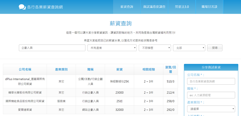 先介紹「各行各業薪資查詢網」,因為類型跟比薪水相類似,所以大家可以查詢同一間公司或相似職缺的狀況,首頁就可輸入職稱或公司名、地區與學歷等項目做搜尋,像阿湯搜尋桃園的企劃人員,出來只有四筆,並列出公司名稱、類別跟相關經驗等細目,來看這個寫薪資疑似 25K 的好了。