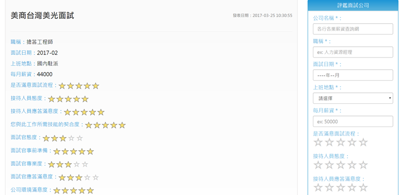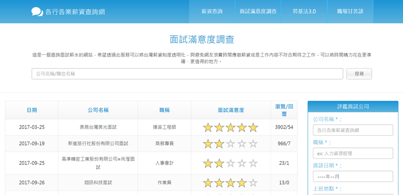 面試滿意度調查這一區就更精確了,一樣也有列出真實的公司名稱和職稱,並以星等代表滿意度,以瀏覽次數和回覆數量排序,看看第一項。