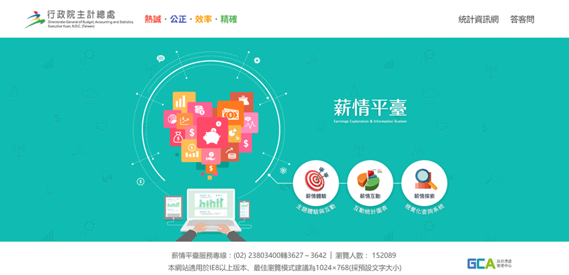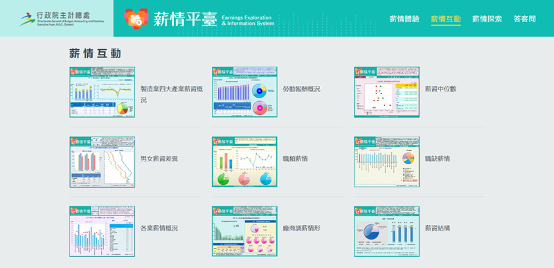 然後就是行政院主計處的「薪情平台」,分為薪情體驗、薪情互動、薪情探索三大塊區域,先來看體驗區。
