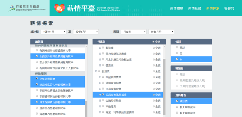 薪情探索這裡也是讓你選擇統計項目、行業別、性別等,以及要探索的資料屬性。