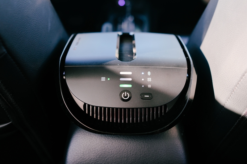 上方為空氣吸入口,髒空氣從中間吸入,通過三合一高效濾網,從面板下方的出風口,輸出乾淨的空氣。風速分別有智慧自動、大跟小可以切換,在開車中,其實就算開到最大風速也不會聽到運轉聲,而小風速則是相當的安靜。