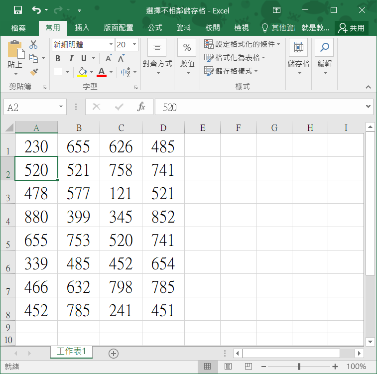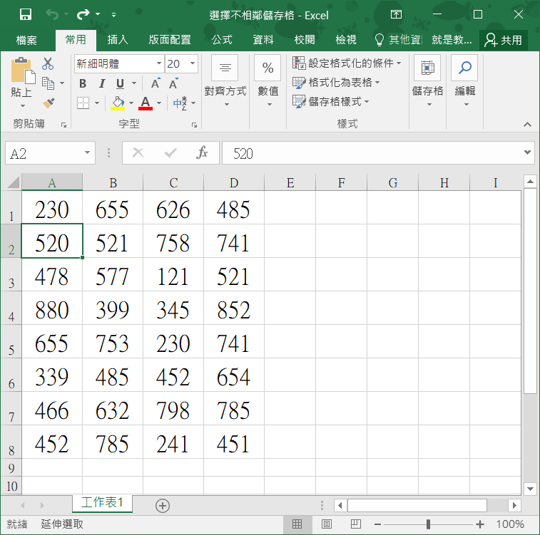 先來看鍵盤+滑鼠的方式,先用滑鼠點選其中一個儲存格,假設是左上角「520」這一格。