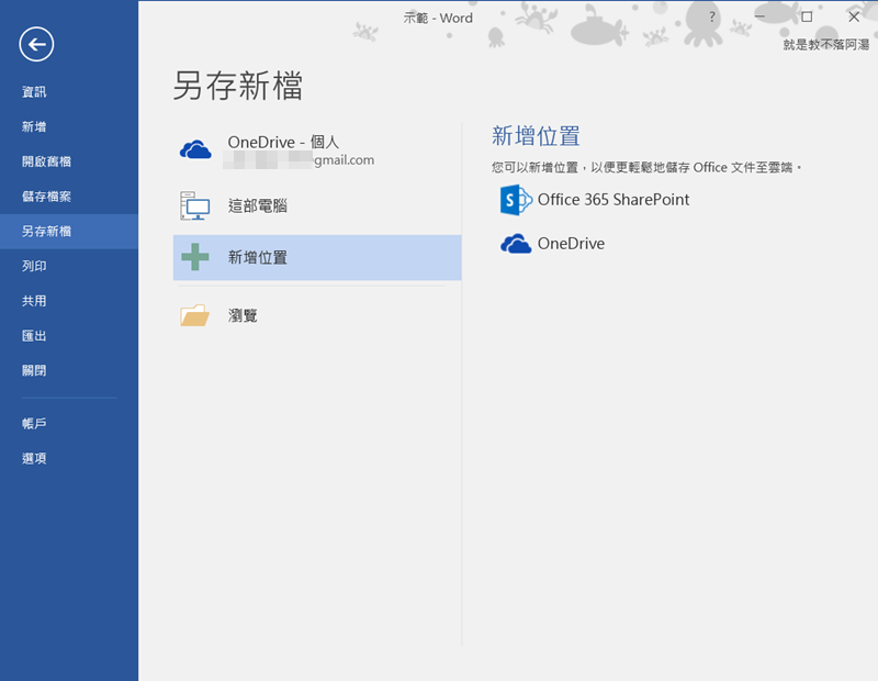 一般來說在 Word 另存新檔的地方只會看到「這部電腦」,Win10 用戶通常也會預設 OneDrive 選項,並無法從這邊新增 Dropbox 和 Google Drive 的位置。