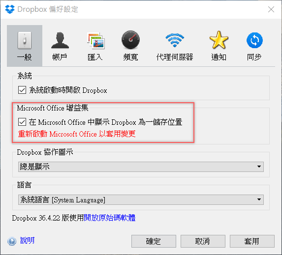 在一般設定的地方勾選 Office 增益集底下的「在 Microsoft Word 中顯示 Dropdox 為一儲存位置」。