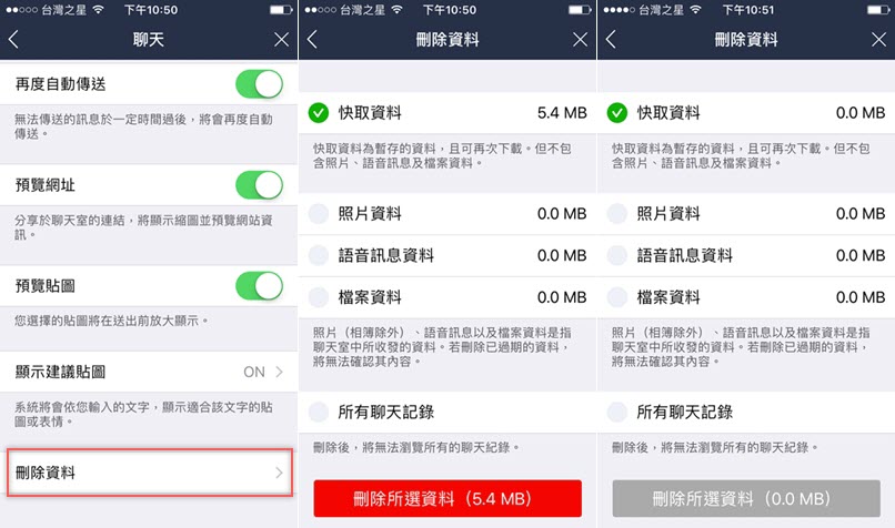 目前 iOS 版本已有內建,從設定區進入聊天選項,到最下方「刪除資料」,再選擇第一項快取資料即可,刪除時間試檔案大小而定。