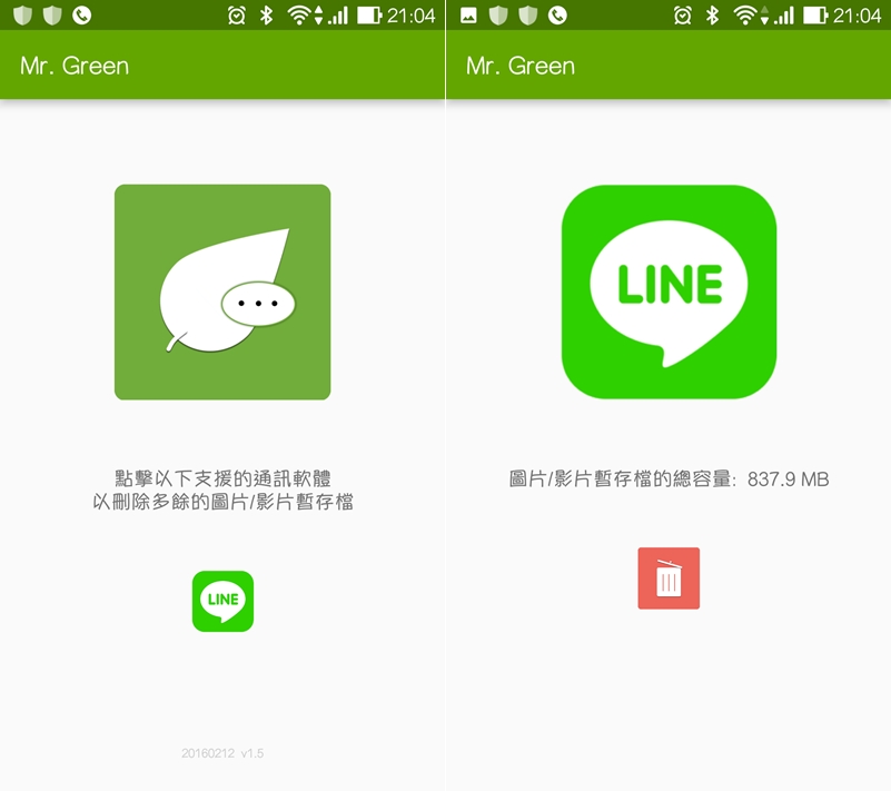 Android 版比較麻煩一點,先下載「Mr. Green」這款 APP,開啟後點下方 Line 圖示,會自動計算暫存檔的總容量,阿湯這支手機的 Line 比較常用所以累積到 837.9MB。
