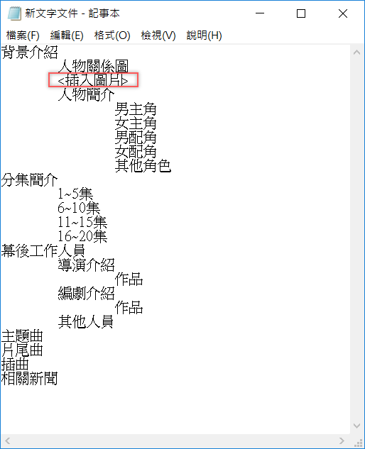 如果有預設需要放圖片的位置,雖然不可能從記事本插入,但可以打上一行備註要進行的動作,這樣就更清楚了。