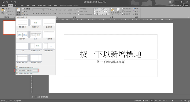 開啟投影片點新增「從大綱插入投影片」。