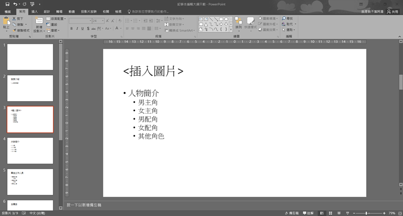 重點來了,將你一層層的大、中、小標題,使用鍵盤上的「Tab」鍵來調整,投影片第一行的大標不用更動,第二層的話就將游標移到文字前方,按一次「Tab」,第三層就按兩次,以此類推,最後完成就會像下圖這樣的結構。