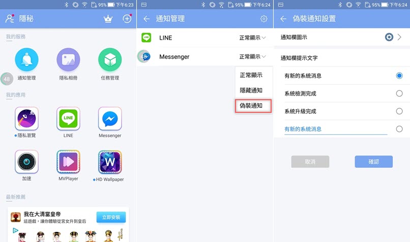 這款 APP 目前只有 Android 版本,首頁先來看通知管理,一般來說會跳出通知的都是社群軟體, 例如 Messenger 就可以設定要正常、隱藏還是偽裝,如果要偽裝還能輸入在通知欄的提示圖示與文字,方便辨識。