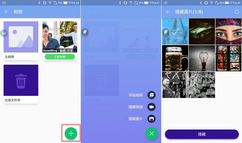 隱私相冊的部分可點右下角「+」新增相冊,或在現有的相冊隱藏影片或圖片,就會連到手機相簿讓你選擇要處置的檔案。