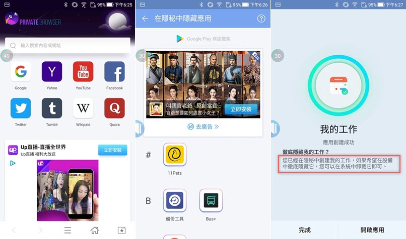 也有提供私密瀏覽功能,而不想被看到的程式可以直接裝在「隱密」裡面,或者選擇已安裝的 APP 例如「我的工作」,設定隱藏後原本手機裡的「我的工作」就可選擇刪除,但要注意的是,如果以後要刪除「隱密」,連同裝在裡面的 APP、相冊等也會一併被刪除。