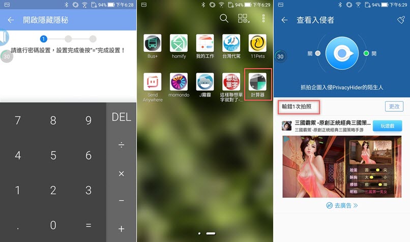 設定密碼之後,出現在手機裡的就會是計算機圖示,如果查看你手機的人也知道這個圖示的真實身分,而試著輸入密碼,就會被拍下來。