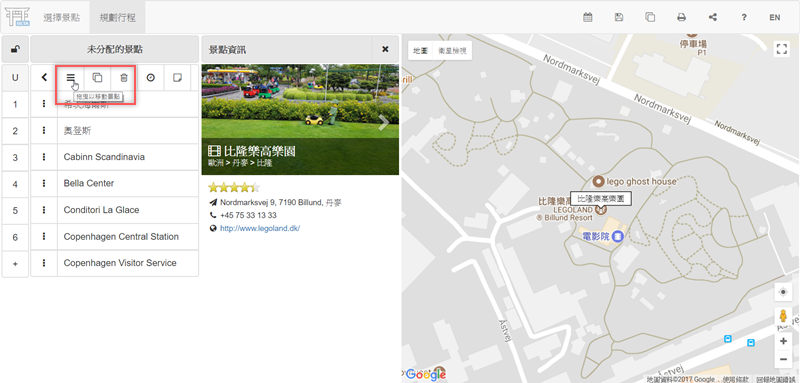 剛剛選擇的景點會放在未分配區,點選後出現編輯項目,可將它拖到要去的那一天,記得要先在右上方設定日期才能調整細節。