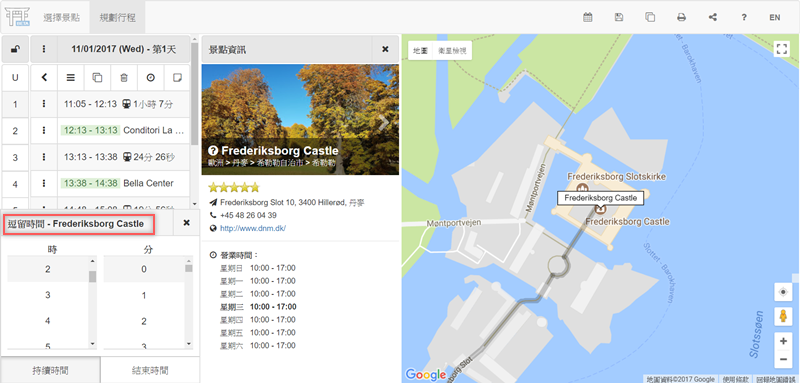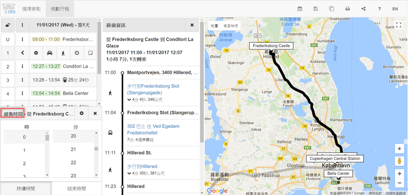 點選項目可調整逗留時間,在你調整的同時行程表還會自動更新,將預排的大眾工具及發車時間往後移,不用自己改。