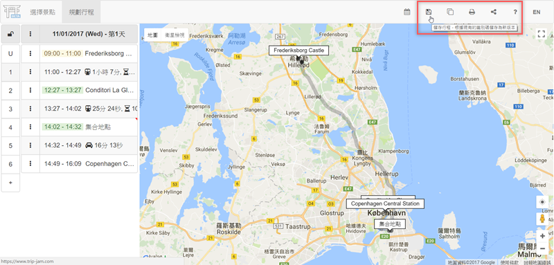 最後就看要儲存、複製、列印或分享,儲存後會提醒你將目前網址記下來,這樣之後只要貼上網址就會連結到行程規劃頁面,可繼續進行編輯。