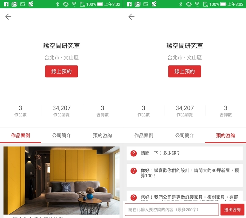 也有提供設計公司的基本資料,可再參考 APP 裡收錄的其他作品,有興趣就直接提出諮詢或線上預約。