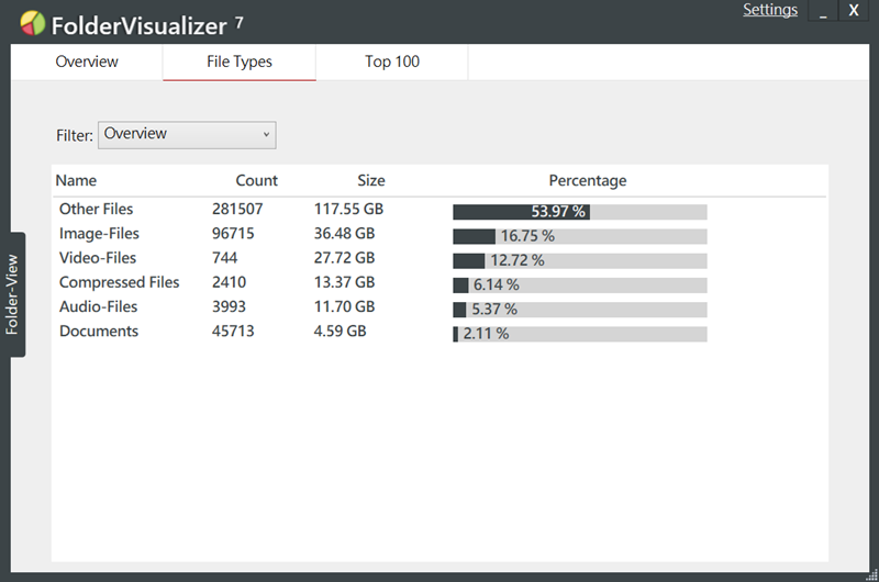 或是從類型這邊來檢視不同類型的檔案數量、大小及硬碟的佔據比。