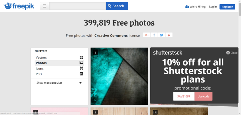 目前有將近 10 萬張圖片,也都是 CC0 免費使用,除了照片外還有向量圖、圖示、PSD 檔等素材可下載,可從縮圖加最愛或分享。