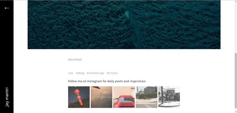 收藏作者來自 Tumblr 的相簿,大概一個禮拜更新一次,充滿天空白雲、光線、空氣感的圖片,也有空拍的風景圖,點圖片後即可進入大圖,再右鍵另存。
