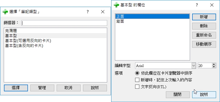 筆記類型除了基本型還有克漏題,基本型也分可選用或是包含反向的卡片,欄位的增減及順序更改也沒問題。