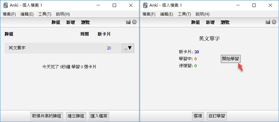 阿湯先建立了 20 張新卡片,開始學習吧。