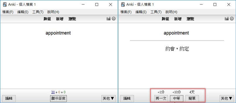 出現正面之後再點顯示答案,然後選擇這張的熟習程度,就會繼續再跳下一張。