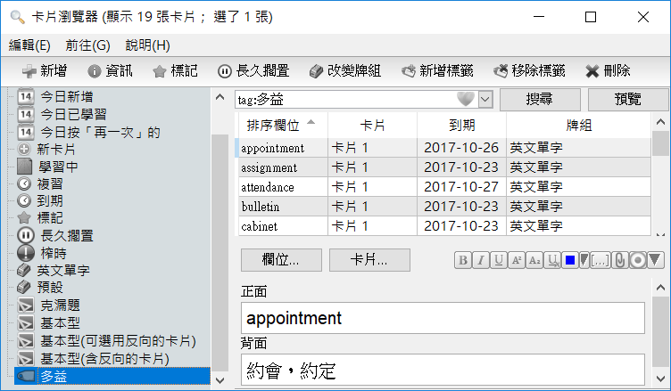 開始新增卡片吧,這應該是使用這套軟體前最大的工程了,輸入正反面內容、標籤,字型和樣式都能更改。