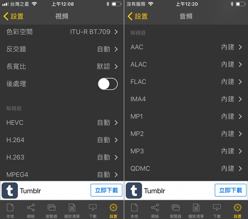 另外就是視頻跟音頻的設定,這邊能看到支援的解碼器如 HEVC、H.264、H.263、MPEG4 等等,還有內建 AAC、ALAC、FLAC、IMA4 等相當多種音頻解碼,可說是沒有不能播放的影音。