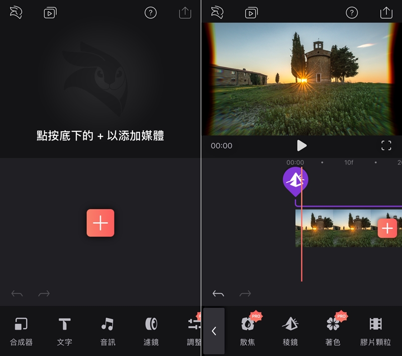 介面很好懂,開啟後先點中間加號看要加入圖片或影片,底下則是合成器、文字、音訊、濾鏡等選項,阿湯先單獨用相片試試,隨便套個特效感覺就不一樣了。