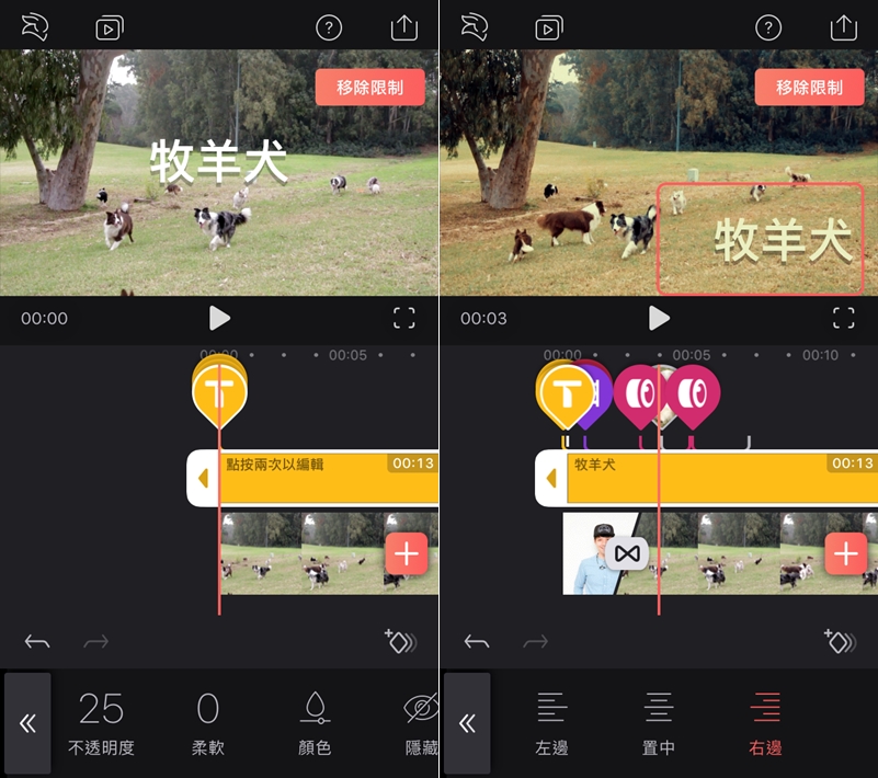 加入影片後除了可在影片前後添加圖片,還能直接覆蓋,並提供不同風格的濾鏡套用,也能再做圖樣或複製等其他調整,因為是免費版所以你用到一半顯示已達圖層上限是正常的。