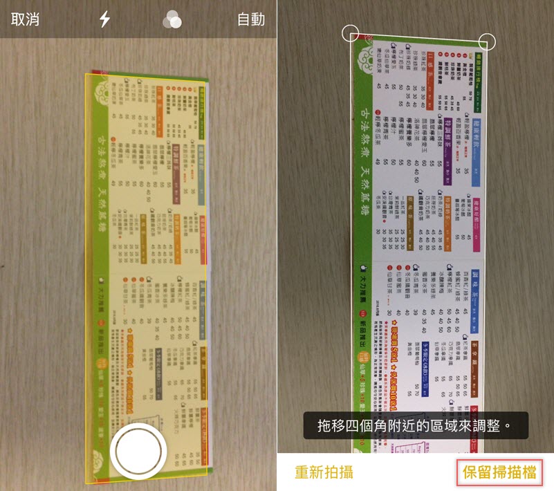 連接到相機,對準物件後會自動判別範圍,這邊阿湯就覺得沒有其他 APP 判定得快又準確,要拍攝後再拖曳四個角來調整,完成後點存檔。