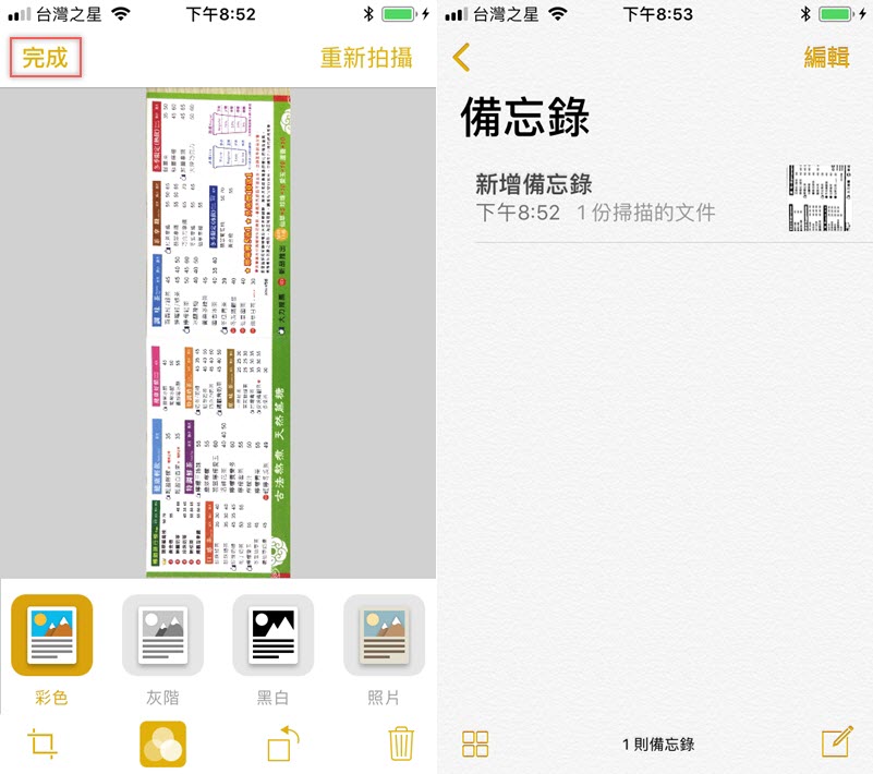 先來看文件掃描,開啟手機備忘錄,點底下加號後選擇「掃描文件」。