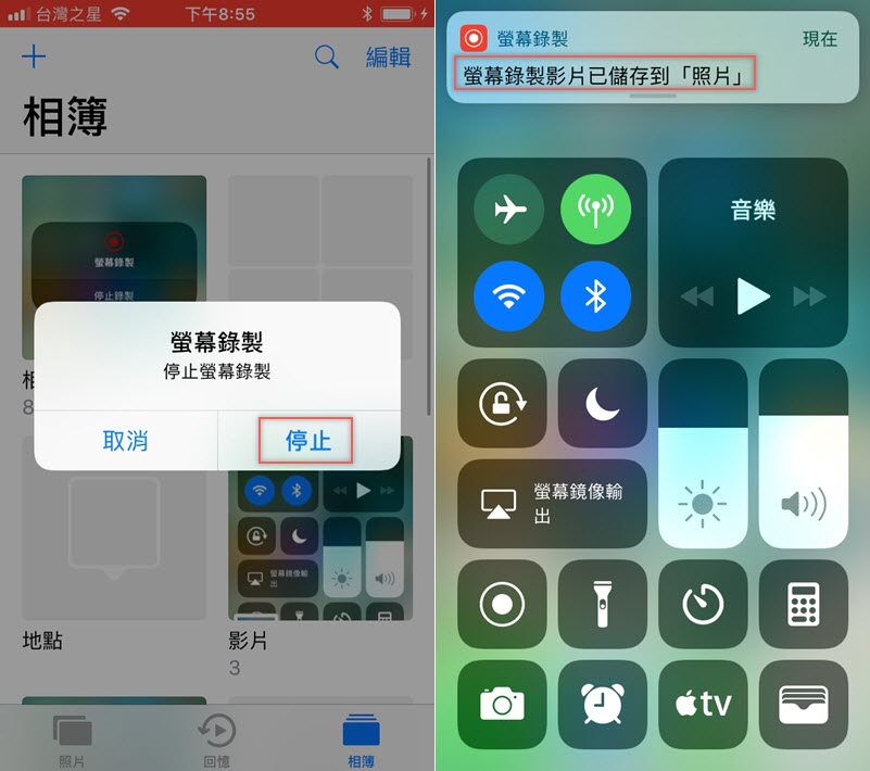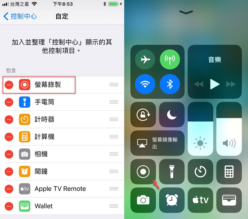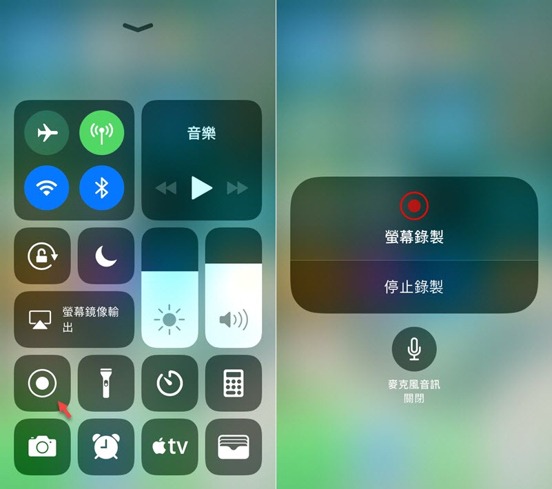 螢幕錄製要先將功能加到控制中心,之後打開控制中心會看到如下圖的按鈕。