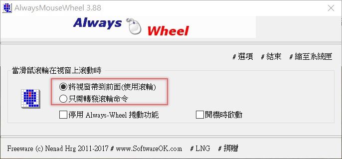 選擇當滑鼠在視窗上滾動時,要將視窗帶到前面,還是只要滾動就好。