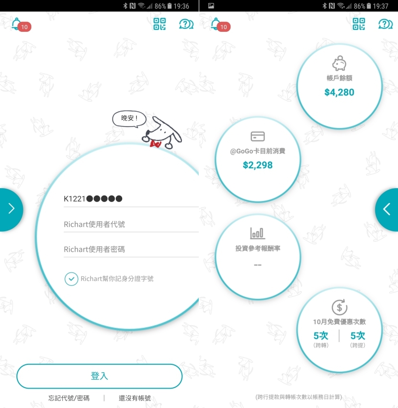 在登入的畫面中,只要你有登入過並勾選身分證字號記憶的話,下次進入 Richart APP 就可以直接往左滑預覽基本資訊,這個是很便利的功能,雖然可以指紋辨識登入,但阿湯最常看的就是目前消費而已啊。