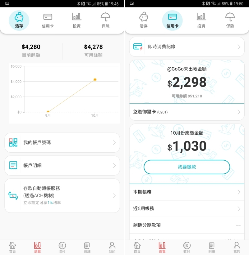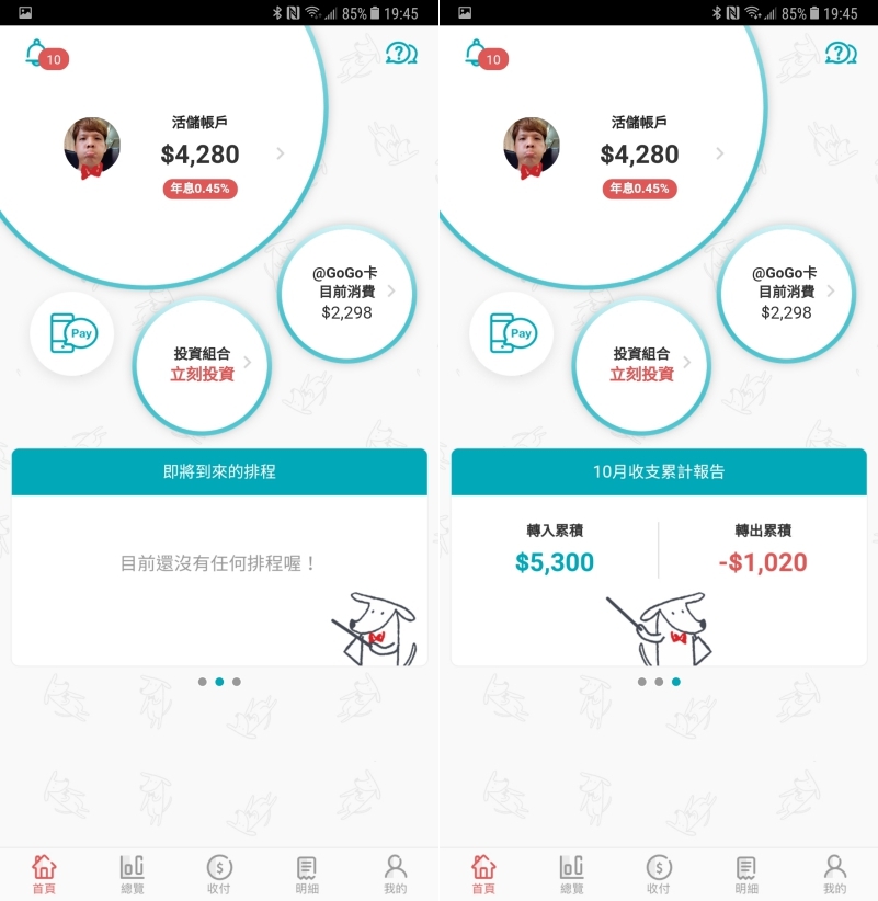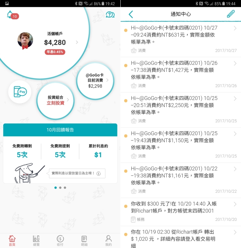 在首頁的部份,除了原本就有的活儲帳戶、信用卡目前消費等外,在新版的介面中加入小秘書功能,可以直接在下方查看目前免費跨轉跨提次數、累計利息等內容,而所有的金流活動都會出現在通知中心中,隨時讓你知道進出款項的動態。