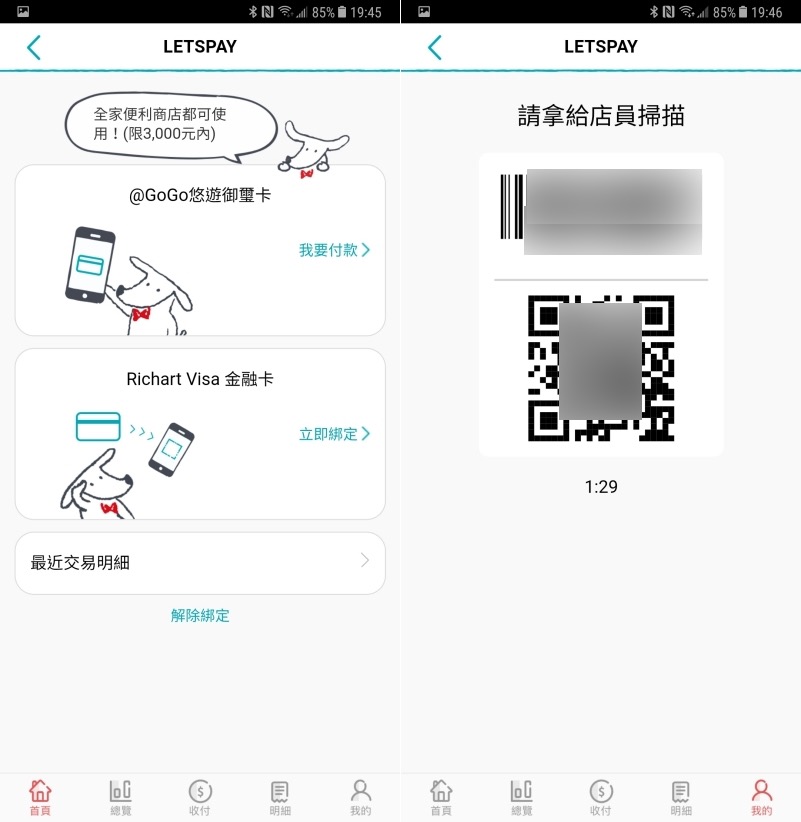 LETSPAY 的功用主要就是可以用在全家便利商店消費所使用,只要拿出手機選擇要透過 @GOGO 信用卡或是 Richart Visa 金融卡支付後就會產生條碼供店員掃描進行付款,非常簡單,還可以順便累積現金回饋,比用悠遊卡消費划算啊!