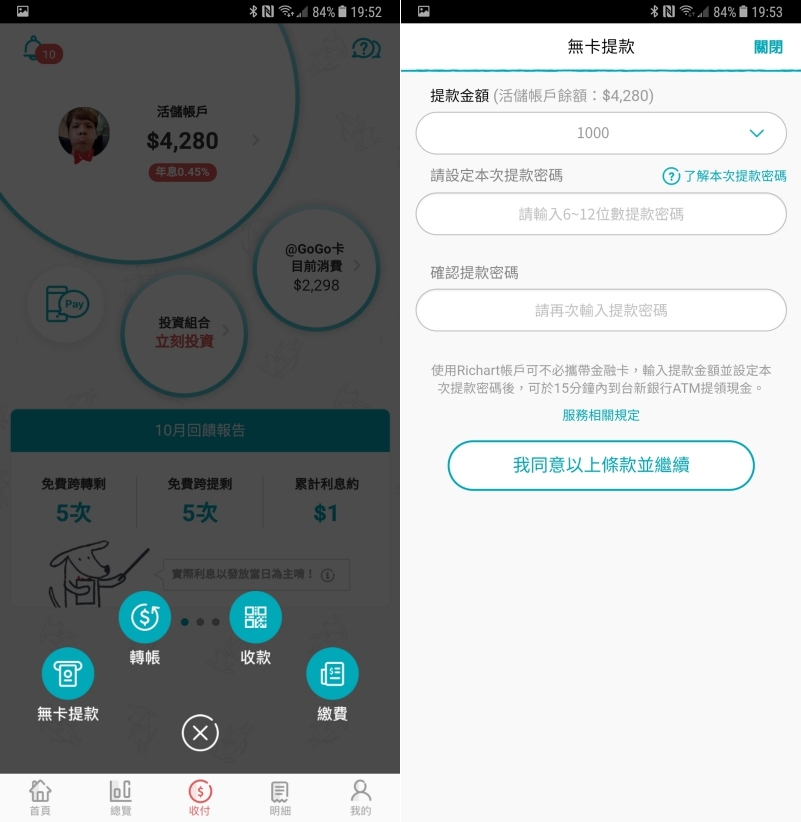 哦對了,有個很棒的是,每月都各有 5 次免手續費進行跨行轉帳及跨行提款可以使用,如果這全部用上,至少也省下了 2 個便當錢了。