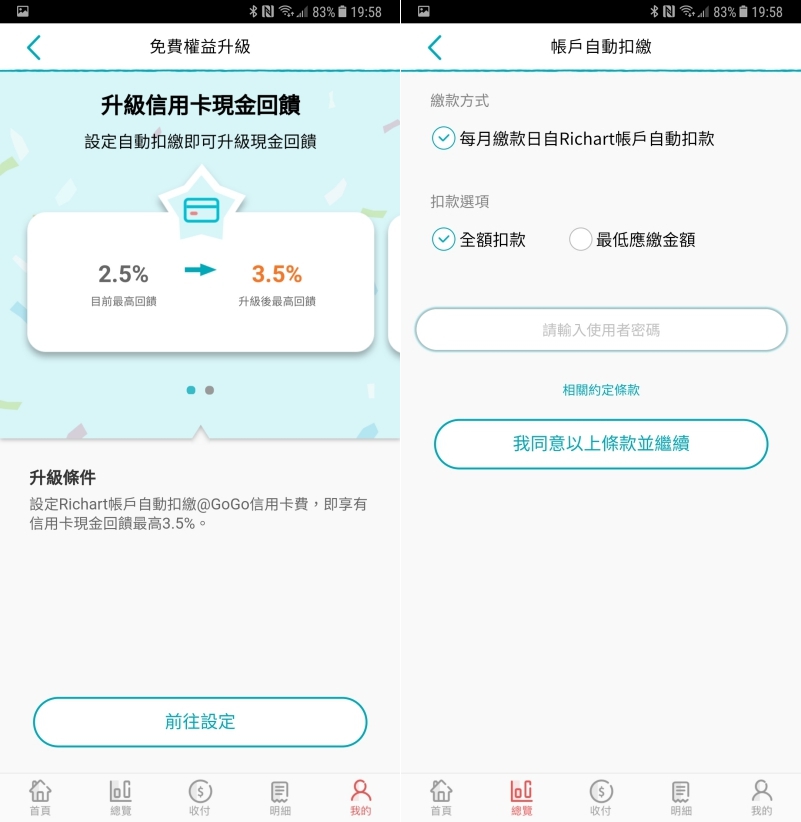 而在免費權益升級中,主要就是讓你知道怎麼讓自己的權益升級,像是 Richart 主打最高 3.5% 現金回饋,記得一定要來這裡設定 Richart 帳戶自動扣繳才會擁有。