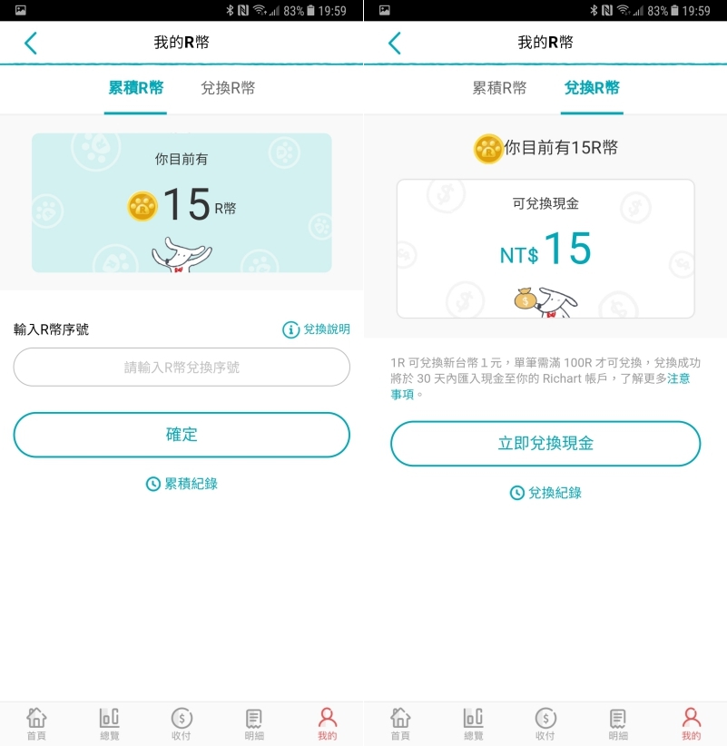 前面提到的 R 幣有什麼作用呢?累積的 R 幣其實就等同於現金,1R 幣等於新台幣 1 元,只要超過 100R 幣就能夠申請兌換。