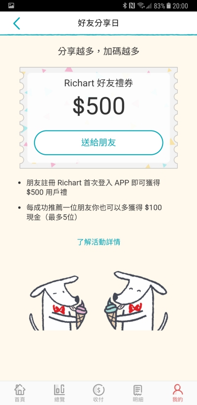 除了 R 幣任務賺現金之外,還可以透過好友分享機制,只要朋友透過你的連結進行申請,每成功一位朋友你可以獲得 100 元現金,而好友也因為你的推薦可以獲得 500 元的用戶禮,一舉二得啊!
